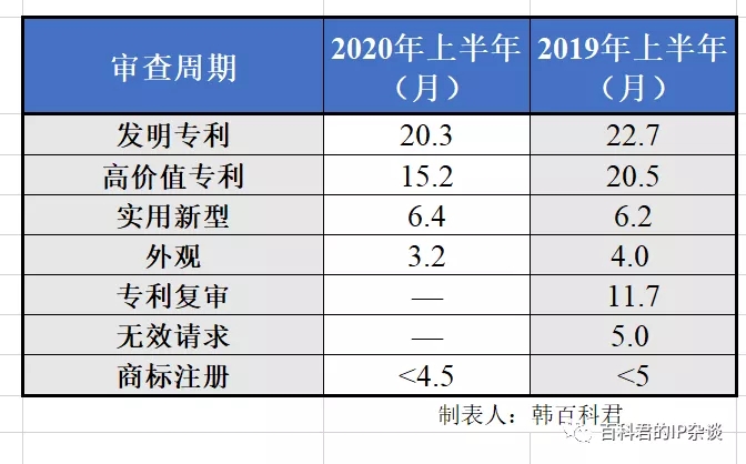 2019年上半年,我國發(fā)明專利審查周期為22.7個月,高價值專利審查周期為20.5個月,實(shí)用新型審查周期為6.2個月,外觀設(shè)計審查周期為4.0個月,專利復(fù)審請求審查周期為11.7個月,專利無效宣告請求審查周期為5.0個月。