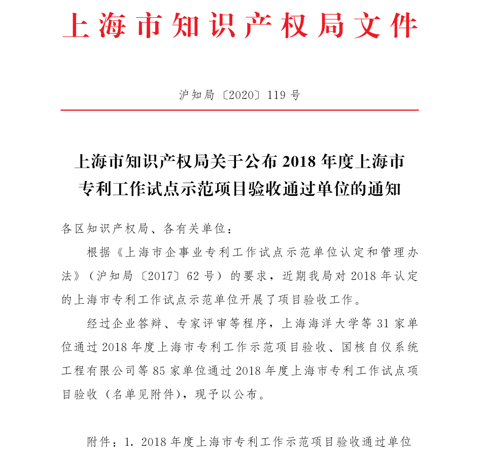 熱烈慶祝通過2018年度上海市專利工作試點示范項目驗收單位