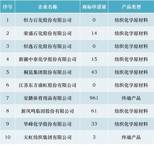 依據2022中國企業500強發布報告顯示,家紡行業上榜前十企業以化學防止原材料為主,原材料供應商由于產品結構較為單一,因此多數僅在其直接關聯的產品/原料中申請商標注冊。而生產終端產品,如服飾鞋帽、床單布料的的企業,由于產品的多樣化,則商標布局相對全面,涉及多個領域。