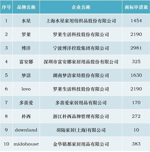 互聯網潮流下,終端產品的售賣以網絡平臺為重要載體,依據天貓雙十一家紡行業相關成交量榜單來看,傳統家紡品牌依舊占據銷售主力,其品牌依托多年品牌培育及多方位營銷推廣,在相關公眾群體中建立有極高的品牌商譽及知名度。新興品牌同步開始發力,商標布局伴隨品牌建設逐步完善。