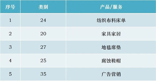 經過統計數據,家紡行業龍頭品牌注冊類別中,第24類作為行業核心類別,占據絕對優勢。而第20類、第27類、第25類作為紡織產品布料的重要衍生產品,則也是“兵家之爭之地”,第35類作為零售、電商等關鍵領域入門門檻型服務,對于企業的重要性可見一斑。