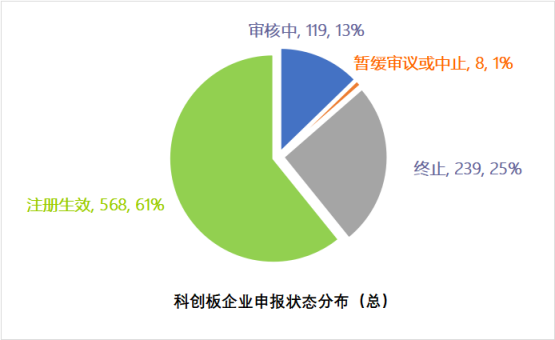 截止到2023年07月28日,科創板共計申報企業934家。其中注冊生效568家,終止(包括終止、終止注冊、不予注冊)239家,審核中(包括已受理、已問詢、上市委會議通過、提交注冊)119家,暫緩審議或中止8家。