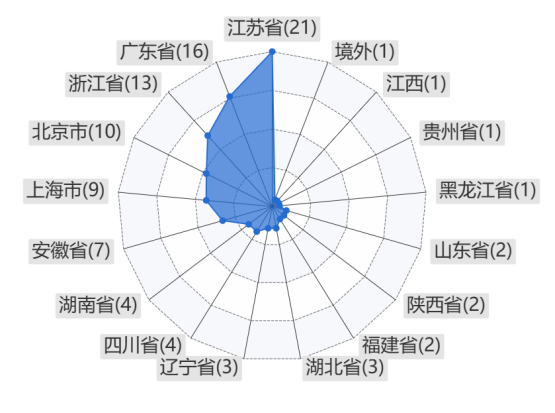 從IPO企業數量地區分布的角度來看,如圖2所示,100家企業的注冊地主要集中在經濟發達的沿海地區與直轄市,其中,江蘇省(21家)、廣東省(16家)、浙江省(13家)、北京市(10家)的合計企業數量占比達到60%。