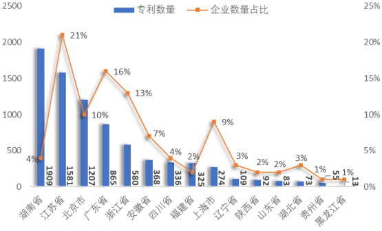 如圖3所示,在各地區的專利申請總數量排名中,排名前五的地區依次為:江蘇省、廣東省、湖南省、北京市、浙江省,與地區分布的企業數量排名基本一致。