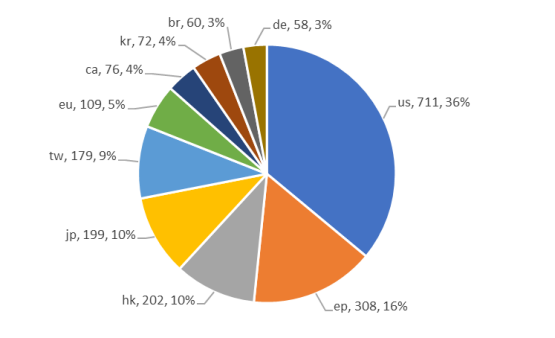 高端裝備行業的海外專利申請量為2365件(排除中國專利申請、PCT申請),如圖9所示,我國高端裝備企業的海外專利布局熱度最高的地域為美國(us),行業布局專利數量為711件;地域布局熱度排在第二的是歐洲(epeu),布局專利數量達417件;高端裝備行業在中國香港(hk)的專利布局熱度排在第三,專利數量達202件。
