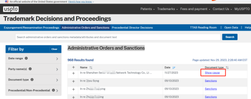 近期,20231127日,USTPO再次發(fā)布了“Supplemental Show Cause Order”(補(bǔ)充舉證指令),延續(xù)了上次的調(diào)查。USTPO搜集了更多證據(jù),本次涉及53,205個(gè)商標(biāo),文件多達(dá)1319頁。此次懲戒,美國(guó)商標(biāo)局還專門列出了這些商標(biāo)代理公司的中文名稱。文件鏈接如下:https://developer.uspto.gov/tm-decisions/search/administrative