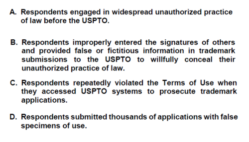 文檔中顯示,被調(diào)查的機(jī)構(gòu)在代理客戶提交美國(guó)申請(qǐng)商標(biāo)的過程中存在許多違規(guī)操作,包括: