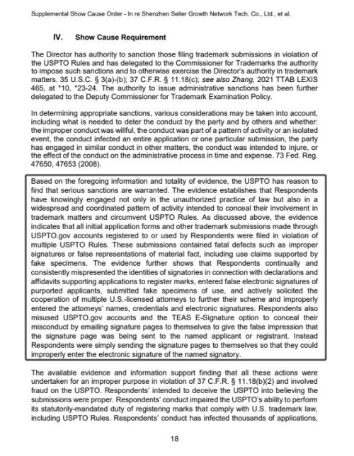繼去年9月,美國(guó)商標(biāo)局針對(duì)深圳某公司發(fā)出了“Order to Show Cause”(陳述理由指令),長(zhǎng)達(dá)600多頁的文件詳細(xì)描述了商標(biāo)注冊(cè)違規(guī)行為。事件涉及13,000多個(gè)商標(biāo)被撤銷。