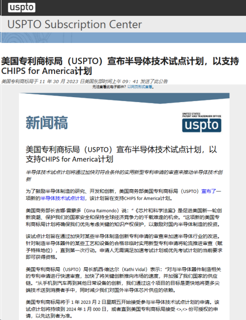 2023年11月30日,美國專利商標局(USPTO)宣布半導體技術試點計劃(Semiconductor Technology Pilot Program),通過對符合條件的美國專利申請,加快進入審查階段來推動半導體技術創新,從而支持美國的芯片計劃。